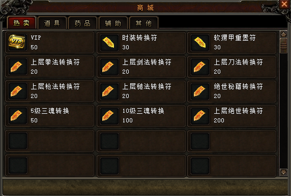 热卖栏内的道具,除VIP外其他都是功能性道具,方便玩家转换样式和同级别武功转换