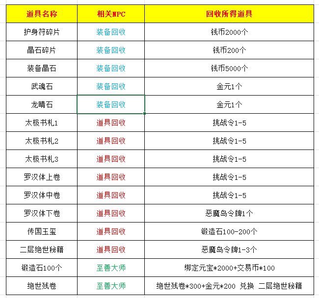 2:道具回收NPC,可分解武功秘籍与部分装备,分解数量为随机制: